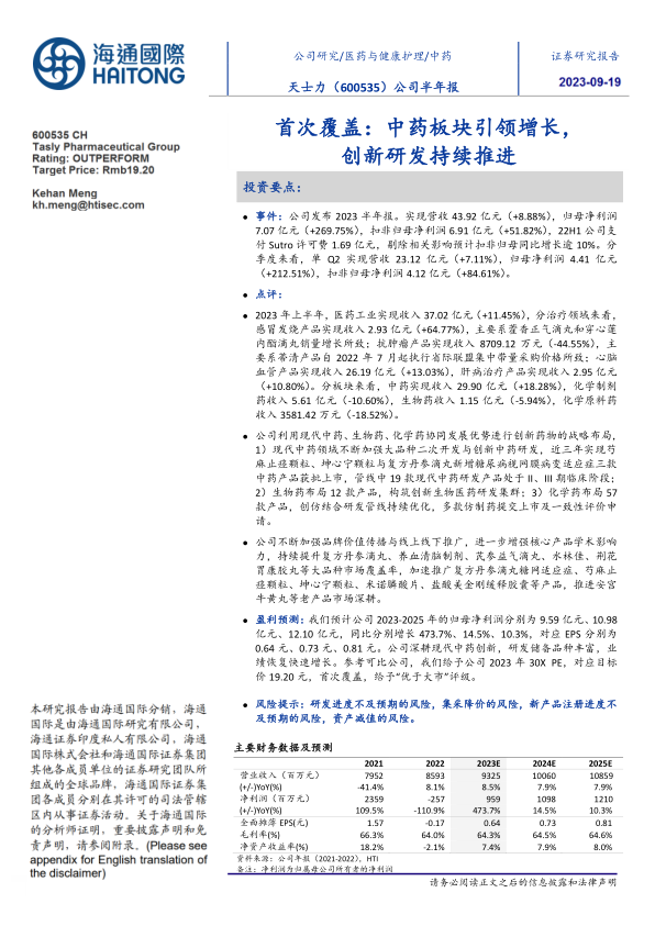 盈利预测:我们预计公司2023-2025年的归母净利润分别为9.59亿元、10.98亿元、12.10亿元,同比分别增长473.7%、14.5%、10.3%,对应EPS分别为0.64元、0.73元、0.81元。公司深耕现代中药创新,研发储备品种丰富,业绩恢复快速增长。参考可比公司,我们给予公司2023年30XPE,对应目标价19.20元,首次覆盖,给予“优于大市”评级。