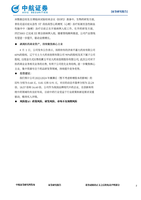 我们预计公司2022-2024年摊薄后(暂不考虑转增股本的影响)的EPS分别为0.68元、0.81元和0.91元,对应的动态市盈率分别为22.24倍、18.57倍和16.60倍。公司作为我国品牌现代中药企业,在创新和传统中药领域均有良好布局,目前中药行业受益于行业政策和新冠需求双重驱动,维持买入评级。