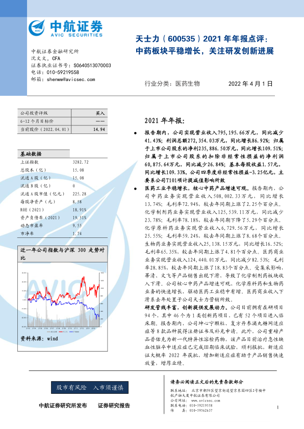 中航证券预计天士力2022-2024年摊薄后EPS分别为0.83元、0.89元和1.00元,对应的动态市盈率分别为18.09倍、16.85倍和14.95倍。鉴于公司作为品牌现代中药企业在创新和传统中药领域的良好布局,以及中药行业受益于政策和新冠需求的双重利好,给予“买入”评级。