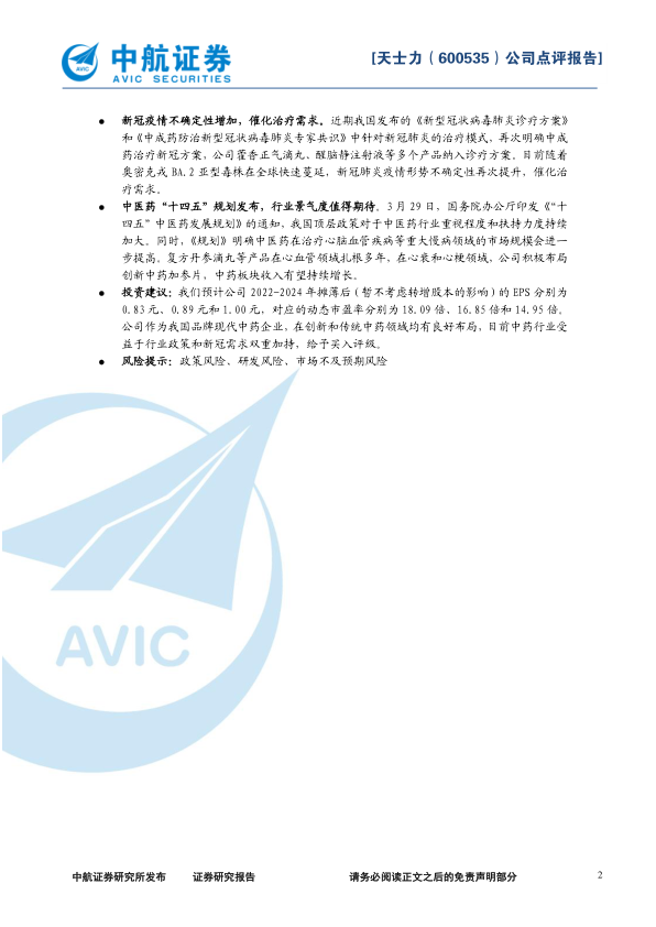 投资建议: 我们预计公司 2022-2024 年摊薄后(暂不考虑转增股本的影响)的 EPS 分别为0.83 元、 0.89 元和 1.00 元,对应的动态市盈率分别为 18.09 倍、 16.85 倍和 14.95 倍。公司作为我国品牌现代中药企业,在创新和传统中药领域均有良好布局,目前中药行业受益于行业政策和新冠需求双重加持, 给予买入评级。