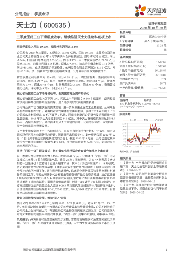 三季度医药工业下滑幅度收窄,继续推进天士力生物科创板上市