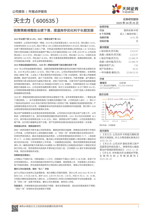 天士力公司在2019年及2020年第一季度经历了业绩下滑,主要原因在于销售策略调整导致的渠道去库存、医保谈判降价以及新冠疫情的短期冲击。然而,公司积极应对挑战,通过优化渠道管理、剥离非核心商业资产以聚焦医药工业主业、持续加大研发投入并推动创新药管线进展,以及实施股权回购以激励核心团队,展现了其战略转型的决心和对未来发展的信心。尽管短期盈利预测有所调整,但公司在生物创新药、中药配方颗粒等领域的布局和“四位一体”研发模式的持续推进,有望在长期驱动业绩恢复性增长,并提升整体财务健康度。因此,分析师维持对天士力的“买入”评级,看好其长期发展潜力。