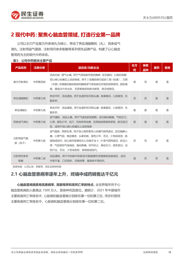 立足现代中药国际化,打造行业第一品牌。在政策支持和国民认可度逐步提高的大背景下,中药行业快速发展,市场持续扩容。公司以主打产品复方丹参滴丸为核心,带动了养血清脑颗粒(丸)、芪参益气滴丸、注射用益气复脉、注射用丹参多酚酸等系列领先品牌产品,构建了以心脑血管用药为主的现代中药大药体系。核心产品复方丹参滴丸主治冠心病心绞痛,发表了多项相关的机理研究成果,销售额在心脑血管中成药市场位居前列。同时复方丹参滴丸在全球9个国家和地区的127个临床研究中心,顺利完成国际化多中心随机双盲、大样本的二期、三期临床试验,实现现代中药国际化的里程碑式突破。2021年10月,复方丹参滴丸获批新增糖尿病视网膜病变的主治功能,进一步提升了复方丹参滴丸的适用范围和市场核心竞争力。养血清脑颗粒/丸、芪参益气滴丸等产品也呈现较好增长。