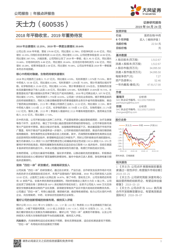 天士力公司在2018年实现了营收和归母净利润的平稳增长,分别达到11.78%和12.25%,经营净现金流大幅改善287.75%。2019年一季度延续强劲增长势头,营收同比增长15.66%,归母净利润同比增长20.64%,显示出良好的发展态势。公司正积极从现代中药企业向生物制药、中药、化学综合性创新药企业转型。