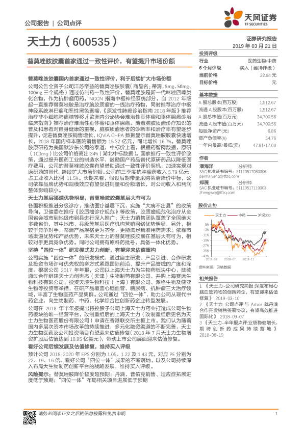 本报告分析了天士力(600535)替莫唑胺胶囊首家通过一致性评价带来的市场机遇,以及公司在基层渠道的优势和“四位一体”研发模式带来的创新潜力。报告认为,公司有望凭借一致性评价加速替代原研药,扩大市场份额,并在基层市场取得更大发展。同时,公司坚持创新,有望迎来估值重构。维持买入评级。