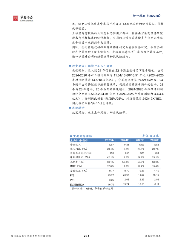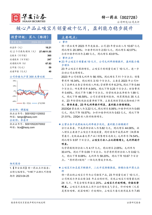 特一药业2023年业绩表现亮眼,核心产品止咳宝片销量突破10亿片,盈利能力稳步提升。中成药板块毛利率优化,但化学原料药板块毛利率有所下降。公司未来将继续推进止咳宝片的二次开发和市场推广,有望实现业绩的持续增长。维持“买入”评级,但需关注政策风险、成本上升风险和研发风险。