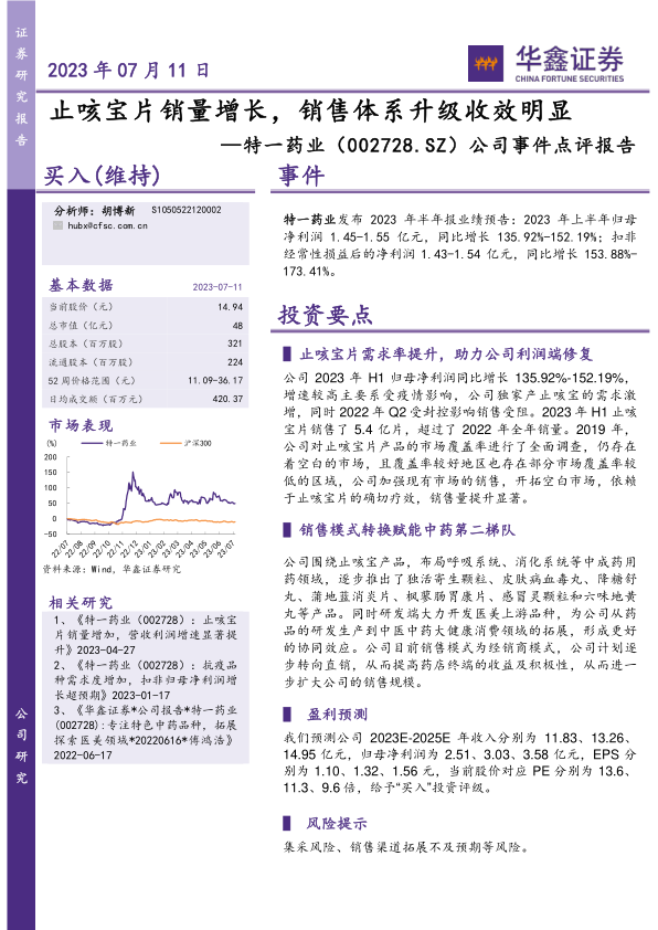 特一药业2023年上半年业绩预告表现亮眼,归母净利润和扣非净利润均实现大幅增长,核心驱动力在于独家产品止咳宝片销量的激增,其上半年销量已超过去年全年。公司通过加强市场覆盖和销售策略,有效把握了市场需求。展望未来,特一药业正积极推进销售模式向直销转型,并持续丰富中成药产品线,同时探索医美上游领域,以构建多元化的大健康产业布局。尽管面临集采和销售渠道拓展不及预期的风险,但基于强劲的业绩增长、优化的销售策略和多元化的产品布局,分析师维持“买入”评级,预计公司未来几年营收和利润将持续增长,盈利能力和运营效率将进一步提升。