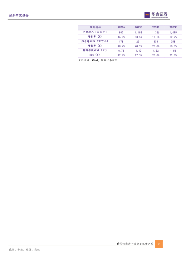 我们预测公司2023E-2025E年收入分别为11.83、13.26、14.95亿元,归母净利润为2.51、3.03、3.58亿元,EPS分别为1.10、1.32、1.56元,当前股价对应PE分别为13.6、11.3、9.6倍,给予“买入”投资评级。