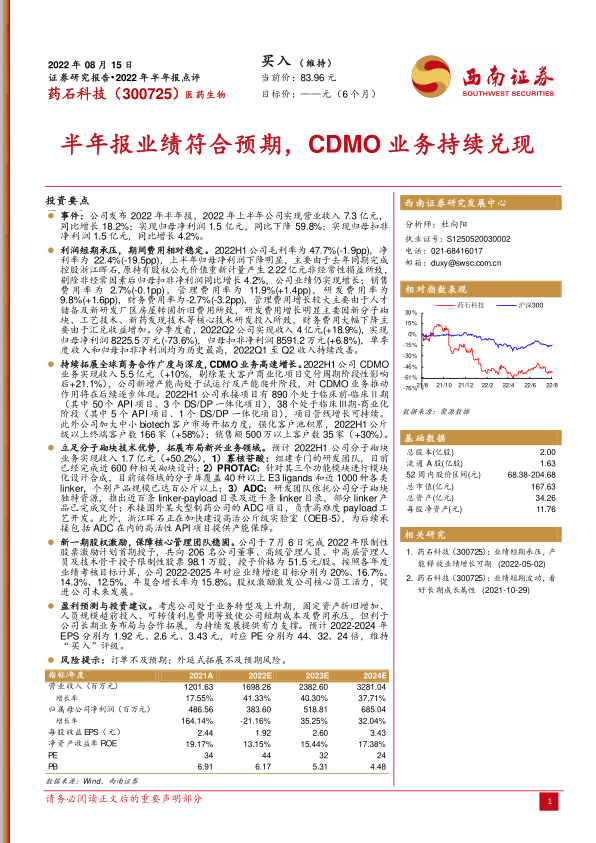 本报告分析了药石科技(300725)2022年半年报,指出公司业绩符合预期,CDMO业务持续兑现,维持“买入”评级。