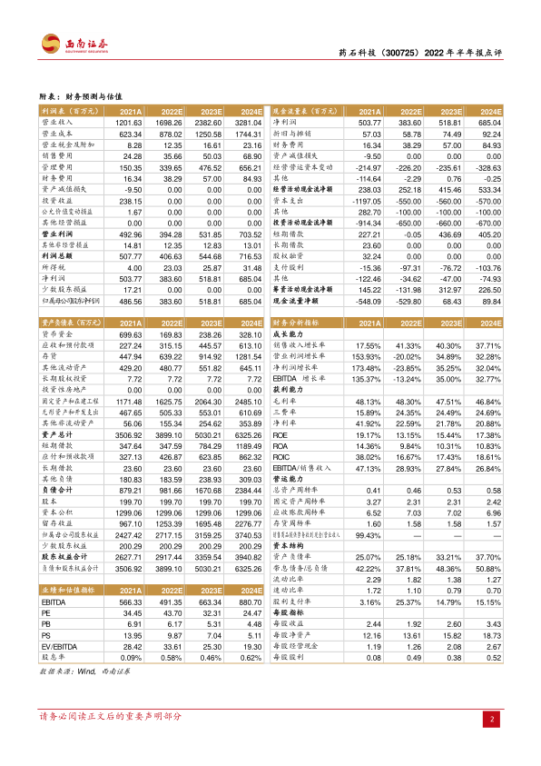 本报告对药石科技2022年半年报进行了深入分析,认为公司虽然短期利润承压,但CDMO业务高速增长,新兴业务领域拓展顺利,股权激励计划保障了核心团队的稳定性。