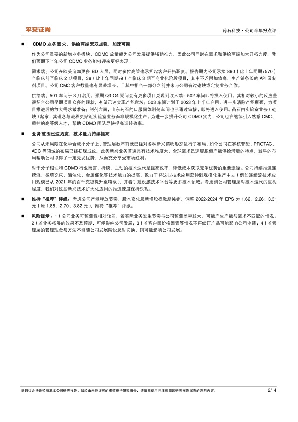 本报告分析了药石科技2022年中报,指出公司业绩逐季改善,CDMO业务加速可期。公司在上年高基数下实现正向增长,分子砌块业务高速增长,CDMO业务需求、供给两端双双加强。同时,公司加大研发投入,积极布局新兴业务,并持续进行技术迭代。维持“推荐”评级,但需关注业务可预测性、业务拓展效果、客户续订情况以及管理理念切换等风险。