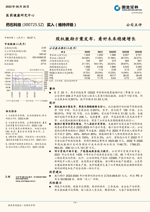 本报告分析了药石科技发布的2022年限制性股票激励计划,认为该计划彰显了公司对未来长期稳健增长的信心。通过对激励方案的考核指标和费用的分析,以及对公司项目管线和产能扩张的梳理,报告维持对药石科技“买入”评级。
