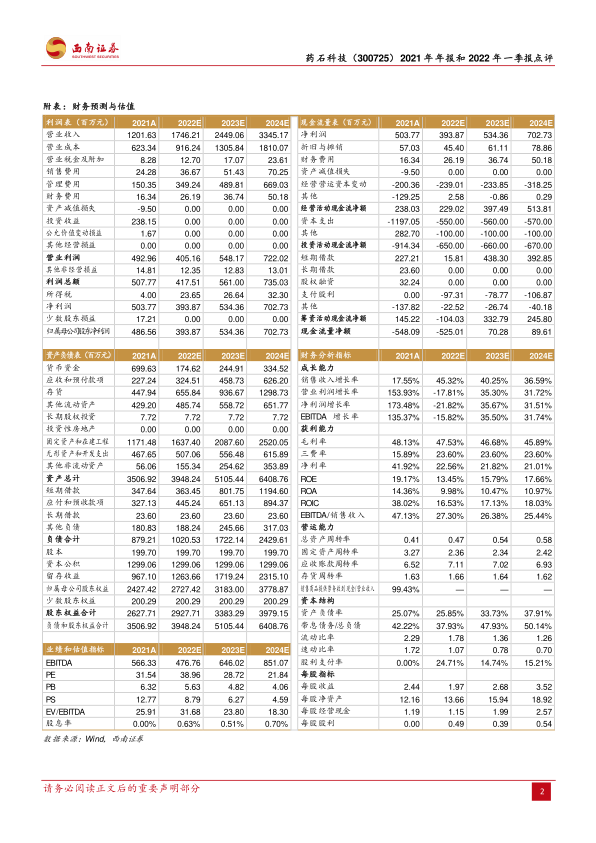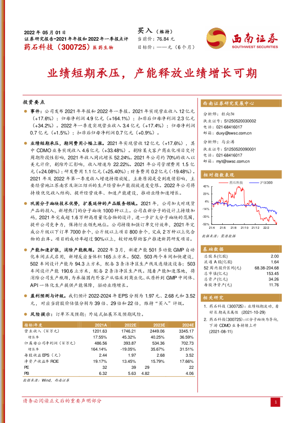 本报告对药石科技(300725)2021年年报和2022年一季报进行了分析,核心观点如下: