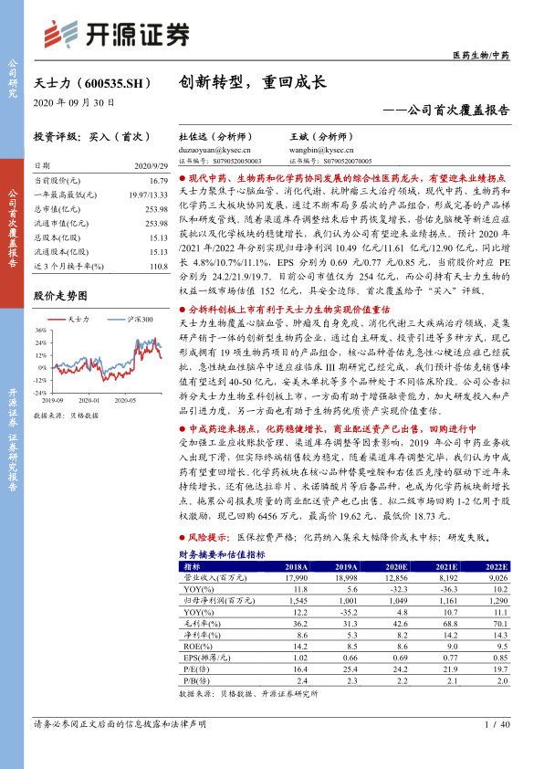 - 2020年8月,公司出售医药商业板块子公司天士营销100%股权,交易完成后将聚焦医药工业,预计将大幅降低资产负债率,提升财务安全性。