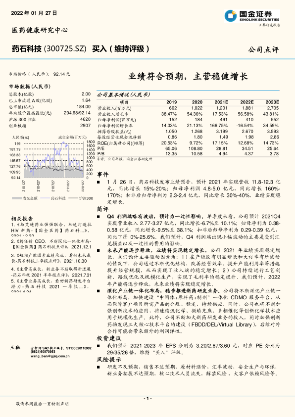 本报告分析了药石科技的业绩预告,认为公司业绩符合预期,主营业务稳健增长。Q4利润端略有波动,预计为一过性影响。公司未来产能逐步释放,业绩将实现稳定增长。公司深化产业链一体化布局,稳步推进新药研发业务,为未来发展提供动力。维持“买入”评级,但需关注研发、销售、原材料、汇率、安全生产、环保、新业务拓展、人才流失、解禁和大客户依赖等风险。