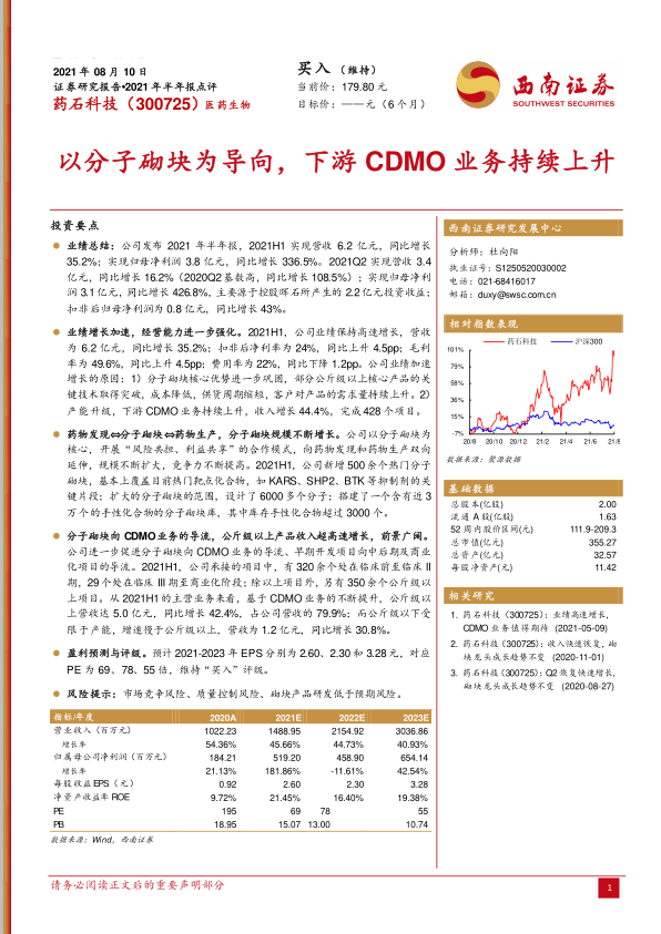 本报告分析了药石科技2021年半年报,指出公司业绩高速增长,经营能力强化,分子砌块业务持续扩张,并有效导流至CDMO业务,尤其是公斤级以上业务增长迅速。报告维持“买入”评级,并对公司未来盈利进行了预测,同时也提示了市场竞争、质量控制和研发风险。