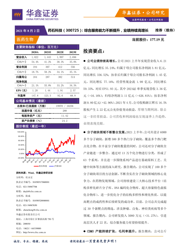 报告提供了药石科技2020年实际(2020A)及2021年至2023年预测(2021E-2023E)的主要财务指标。