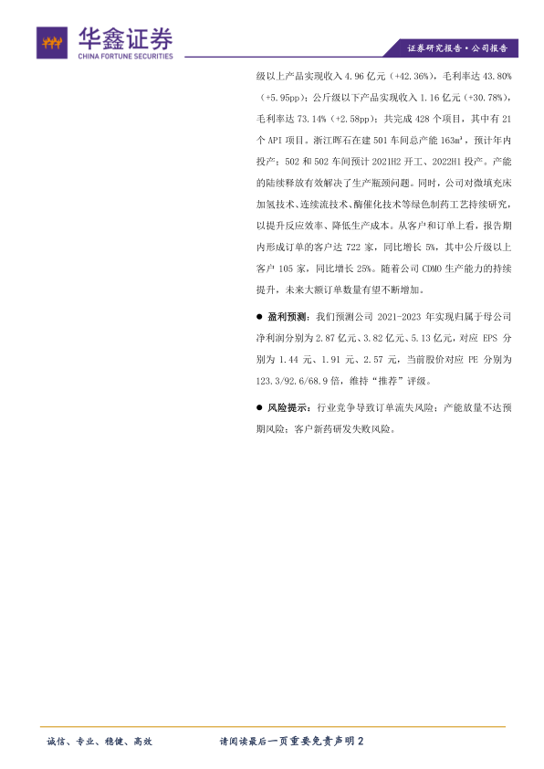 CDMO 产能持续扩张,毛利率提升。 报告期内,公司公斤级以上产品实现收入 4.96 亿元(+42.36%),毛利率达 43.80%(+5.95pp);公斤级以下产品实现收入 1.16 亿元(+30.78%),毛利率达 73.14%(+2.58pp);共完成 428 个项目,其中有 21个 API 项目。 浙江晖石在建 501 车间总产能 163m3,预计年内投产; 502 和 502 车间预计 2021H2 开工、 2022H1 投产。 产能的陆续释放有效解决了生产瓶颈问题。 同时,公司对微填充床加氢技术、连续流技术、酶催化技术等绿色制药工艺持续研究,以提升反应效率、降低生产成本。 从客户和订单上看,报告期内形成订单的客户达 722 家,同比增长 5%,其中公斤级以上客户 105 家,同比增长 25%。随着公司 CDMO 生产能力的持续提升,未来大额订单数量有望不断增加。