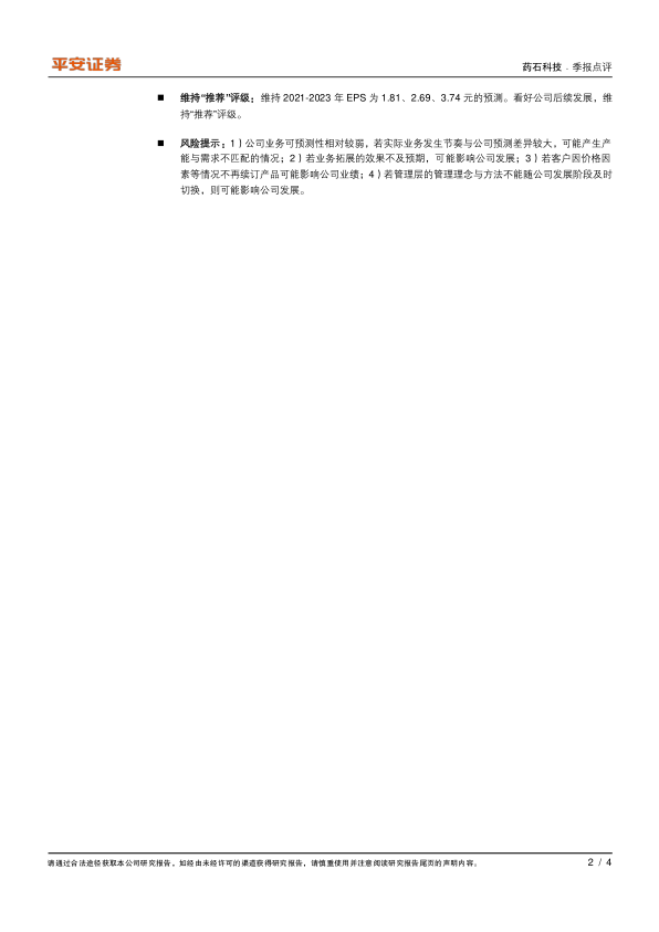 本报告分析了药石科技2021年一季度的业绩表现,指出公司营收和净利润均实现超预期增长,毛利率有所提升,订单盈利能力改善具有可持续性。公司完成对晖石的股权收购,产能有望在下半年进一步扩充。维持公司2021-2023年的盈利预测和“推荐”评级,同时也提示了业务可预测性、业务拓展、客户续订和管理等方面的风险。