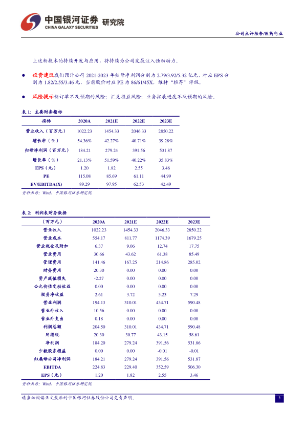 投资建议我们预计公司2021-2023年归母净利润分别为2.79/3.92/5.32亿元,对应EPS分别为1.82/2.55/3.46元,当前股价对应PE为86/61/45X,维持“推荐”评级。