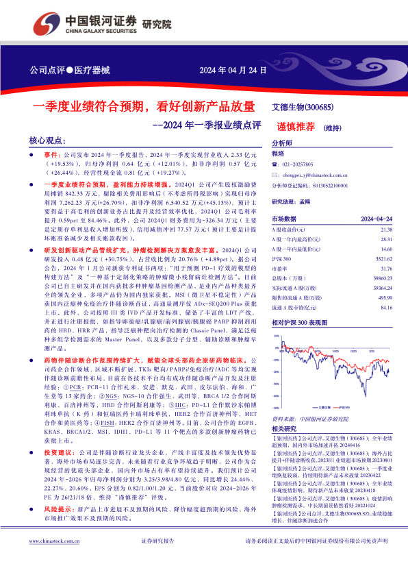 投资建议:公司是伴随诊断行业龙头企业,产线丰富度及技术领先优势显著,海外市场布局逐步完善,未来随着行业竞争环境趋于明晰,公司作为合规经营的优质头部企业,国内外市场占有率有望持续提升。我们预计公司2024年-2026年归母净利润分别为3.25/3.98/4.80亿元,同比增长24.44%、22.27%、20.60%,EPS分别为0.82/1.00/1.20元,当前股价对应2024-2026年PE为26/21/18倍,维持“谨慎推荐”评级。
