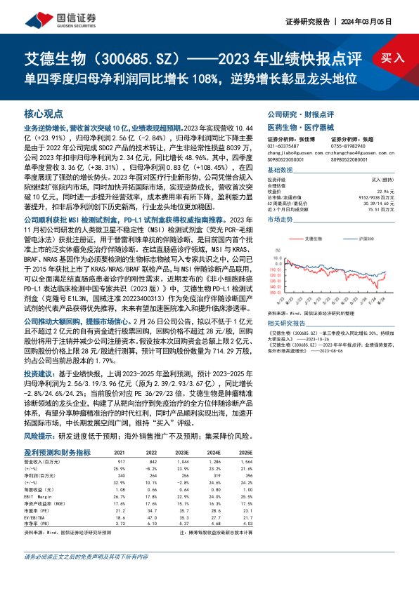 基于2023年业绩快报,国信证券上调了艾德生物2023-2025年的盈利预测。预计2023-2025年归母净利润分别为2.56亿元、3.19亿元和3.96亿元(原预测为2.39亿元、2.93亿元和3.67亿元),同比增长率分别为-2.8%、24.6%和24.2%。当前股价对应2023-2025年PE分别为36倍、29倍和23倍。鉴于艾德生物作为肿瘤精准诊断领域的龙头企业,构建了全面的伴随诊断产品体系,有望充分受益于肿瘤精准治疗的时代红利,并加速开拓国际市场,中长期发展空间广阔,因此维持“买入”评级。