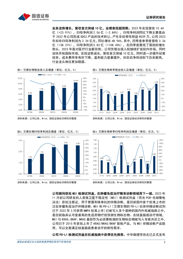 艾德生物在2023年展现了强劲的业绩增长势头,营收首次突破10亿元,扣非归母净利润创历史新高,尤其第四季度表现亮眼,彰显了其在复杂市场环境下的逆势增长能力和行业龙头地位。公司在产品创新方面持续发力,MSI检测试剂盒的获批和PD-L1检测试剂盒获得权威指南推荐,进一步巩固了其在肿瘤精准诊断领域的领先优势。同时,公司推出大额股票回购计划,有效提振了市场信心。综合来看,艾德生物凭借其全面的伴随诊断产品体系、持续的研发创新和积极的市场拓展策略,有望继续分享肿瘤精准治疗的时代红利,未来发展空间广阔,投资评级维持“买入”。
