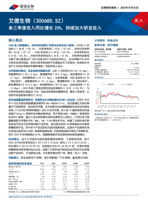 艾德生物在2023年前三季度展现出稳健的收入增长,尽管短期利润受非经常性损益和汇率波动影响,但核心业务盈利能力和经营性现金流表现优异。公司在产品创新方面取得重要进展,高通量基因测序仪获批,并与国际巨头深化合作,进一步巩固了其在肿瘤精准诊断领域的领先地位。中国伴随诊断市场的巨大潜力以及公司全面的产品体系和国际化战略,为其提供了广阔的中长期发展空间。尽管盈利预测有所下调,但基于其行业龙头地位和未来增长潜力,国信证券维持“买入”评级。投资者需关注研发进度、海外销售及集采降价等风险因素。