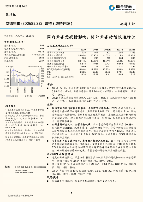 艾德生物在2022年前三季度展现出国内业务承压与海外业务强劲增长并存的局面。尽管国内市场受疫情影响导致营收短期下滑,但海外市场的扩张、高研发投入以及战略合作(如与百济神州的伴随诊断合作)为公司提供了重要的增长驱动力。分析师基于资产处置收益和股权转让等因素,对未来盈利预测进行了调整,预计2023年净利润将出现短期波动,但2024年有望恢复强劲增长。公司健康的财务结构、持续的创新能力和积极的市场拓展策略,共同支撑了其长期投资价值。综合来看,艾德生物在精准医疗领域具备核心竞争力,未来发展潜力可期,维持“增持”评级。