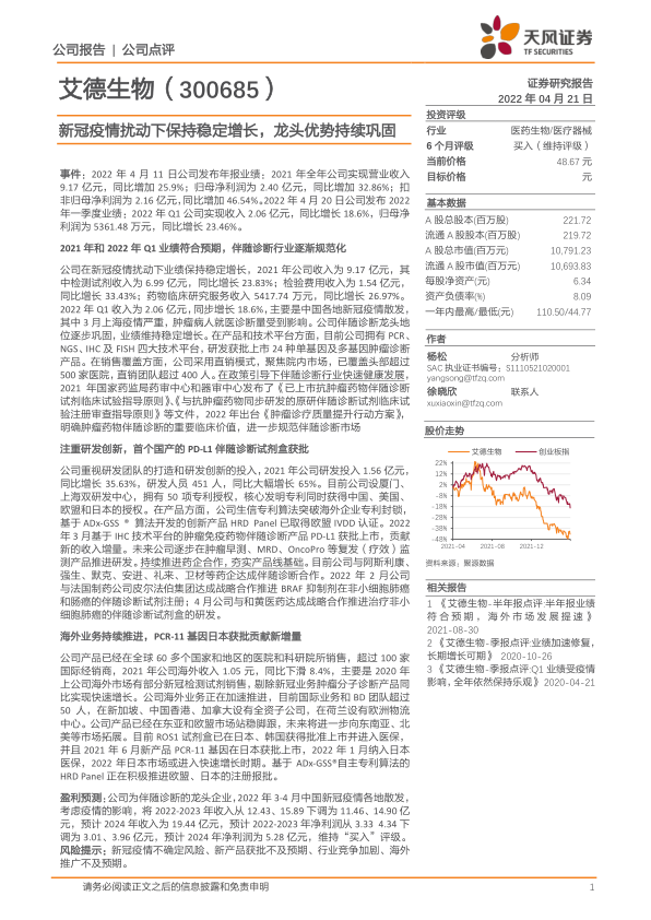 盈利预测:公司为伴随诊断的龙头企业,2022年3-4月中国新冠疫情各地散发,考虑疫情的影响,将2022-2023年收入从12.43、15.89下调为11.46、14.90亿元,预计2024年收入为19.44亿元,预计2022-2023年净利润从3.334.34下调为3.01、3.96亿元,预计2024年净利润为5.28亿元,维持“买入”评级。
