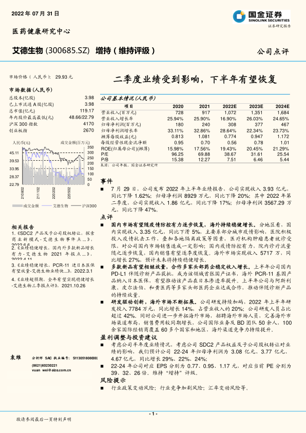 艾德生物在2022年上半年受国内疫情影响,业绩短期出现下滑,但海外市场保持强劲增长,显示出其国际化战略的成效。公司通过持续的研发投入、多款创新伴随诊断产品的获批以及与头部药企的战略合作,为未来的业绩增长奠定了坚实基础。尽管面临行业政策、市场竞争和汇率波动等风险,但鉴于公司在创新和市场拓展方面的持续努力,预计下半年业绩有望恢复,且长期增长潜力显著。国金证券维持对艾德生物的“增持”评级。
