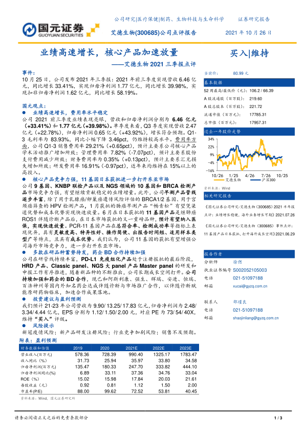 本报告分析了艾德生物(300685)2021年三季报,指出公司业绩高速增长,主要得益于核心产品竞争力的提升和市场拓展。公司在基因检测领域具有优势,并通过与国内外知名药企的合作,不断加强伴随诊断业务,为长期发展奠定基础。