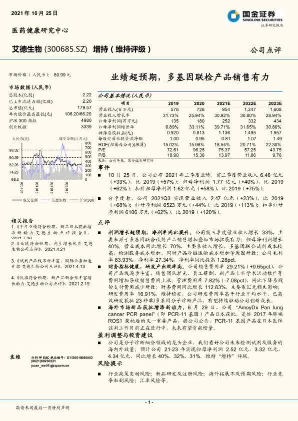 公司是分子诊断细分领域的龙头企业,我们看好公司未来检测试剂及服务的海内外放量;预计公司21-23年实现归母净利润2.52亿元、3.32亿元、4.34亿元,同比增长40%、32%、31%。维持“增持”评级。