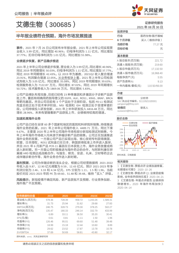 盈利预测:公司为伴随诊断的龙头企业, 根据公司经营数据将 2021-2022年收入由 9.87、 12.90 亿元调整为 9.59、 12.43 亿元, 预计 2021-2023 年净利润分别为 2.46、 3.33 和 4.34 亿元, EPS 分别为 1.11、 1.5 和 1.96,当前股价对应 2021-2023 年的 PE 为 69.60、 51.48 和 39.48, 维持“买入”评级。