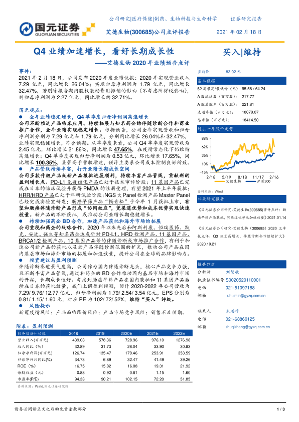 本报告分析了艾德生物2020年业绩快报,指出公司全年业绩稳定增长,Q4单季度归母净利润高速增长。公司通过不断丰富产品管线,加强与药企的BD合作,加速产品获批和市场拓展,为长期稳健增长奠定基础。考虑到公司良好的发展前景,维持“买入”评级,但同时也提示了新冠疫情、产品降价、市场竞争和销售不及预期等风险。
