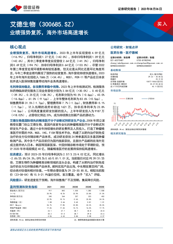 投资建议:预计2023-25年归母净利润为2.57/3.23/4.02亿元,同比增长-2.6%/25.8%/24.3%;EPS为0.65/0.81/1.01元,当前股价对应PE39/31/25倍。艾德生物作为肿瘤精准诊断领域的龙头企业,构建了从靶向治疗到免疫治疗的全方位伴随诊断产品体系,顺利实现产品出海,中长期发展空间广阔。综合绝对估值和相对估值,一年期合理估值为29.23-30.85元,相较当前股价(23-08-04)有15.5-21.9%溢价空间,首次覆盖,给予“买入”评级。