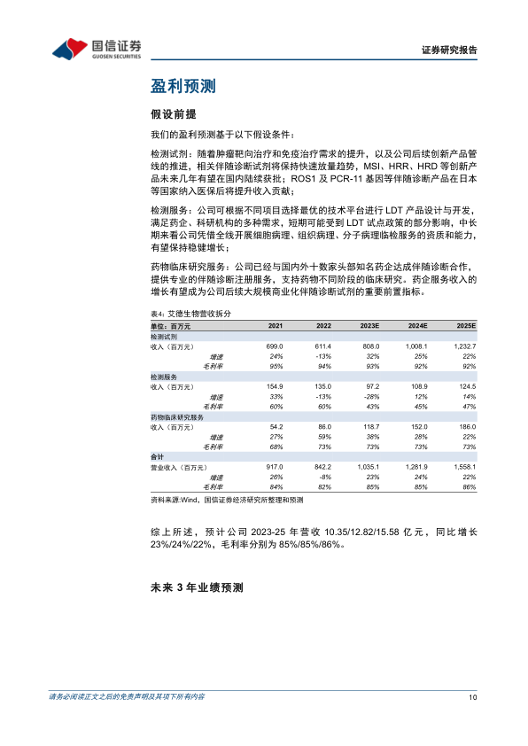 基于对公司业务增长和盈利能力的假设,包括检测试剂业务的快速放量、检测服务业务的稳健增长以及药物临床研究服务收入的提升,国信证券经济研究所预计艾德生物2023-2025年营业收入将分别达到10.35亿元、12.82亿元和15.58亿元,同比增长23%、24%和22%。归母净利润预计分别为2.57亿元、3.23亿元和4.02亿元,同比增长-2.6%、25.8%和24.3%。