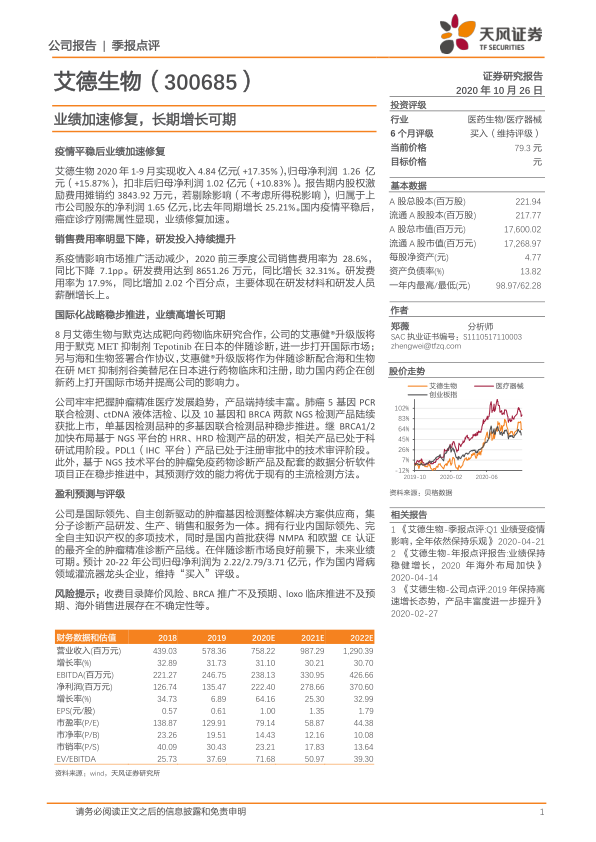 艾德生物在2020年前三季度表现出强劲的业绩修复能力,得益于国内疫情平稳后癌症诊疗的刚需属性。公司通过有效的费用控制和持续的研发投入,不断丰富产品线,巩固在肿瘤精准医疗领域的领先地位。国际化战略的稳步推进,特别是与默克和海和生物的合作,为公司打开了更广阔的市场空间。维持“买入”评级,反映了市场对公司未来增长潜力的认可。