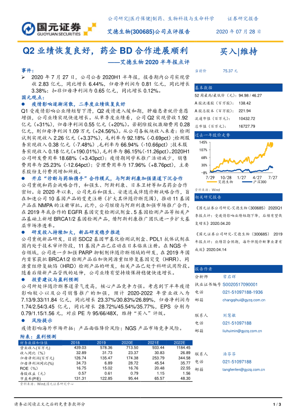 艾德生物2020半年报点评:Q2业绩恢复良好,药企BD合作进展顺利