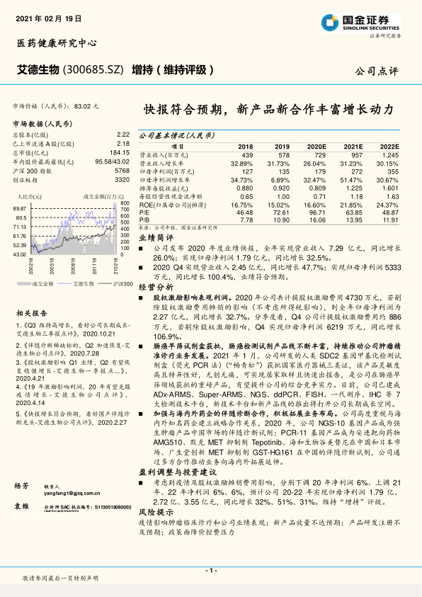 艾德生物在2020年实现了符合预期的业绩增长,展现出强劲的盈利能力。公司通过有效的股权激励机制、在肠癌早筛领域的创新突破(“畅青松”获批)以及与国内外药企在伴随诊断方面的深度合作,成功构建了多元化的增长动力。尽管面临疫情、新产品放量和政策等风险,但其在肿瘤精准诊疗领域的持续投入和市场拓展策略,使其具备良好的长期成长潜力。分析师基于对未来盈利的调整预测,维持了“增持”的投资建议。