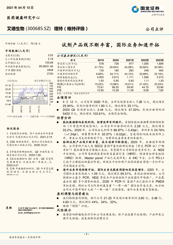 艾德生物在2020年实现了营收和净利润的稳健增长,尤其在剔除股权激励影响后,盈利能力表现更为突出。公司通过不断丰富检测试剂产品线,推动技术创新,并积极拓展国内外市场,特别是国际业务实现了高速增长,显示出强大的市场韧性和发展潜力。尽管毛利率受成本因素略有下降,但通过费用率的有效控制,净利率得以提升,运营效率也持续改善。展望未来,随着新产品的逐步放量和国际化战略的深入推进,公司有望保持持续增长态势。