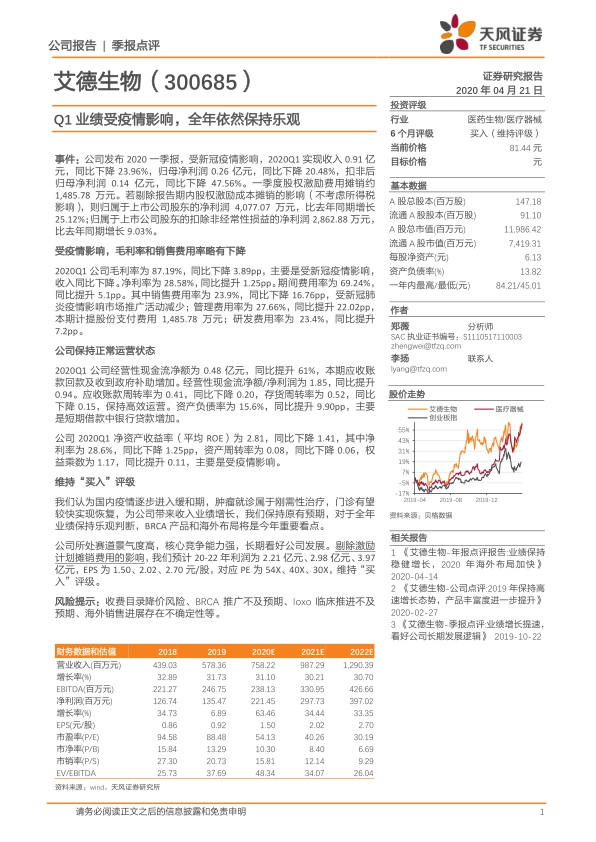 剔除股权激励计划摊销费用的影响,预计艾德生物2020-2022年归母净利润分别为2.21亿元、2.98亿元、3.97亿元,对应EPS分别为1.50元/股、2.02元/股、2.70元/股,对应PE分别为54X、40X、30X。同时,报告提示了主要风险,包括收费目录降价风险、BRCA推广不及预期、loxo临床推进不及预期以及海外销售进展存在不确定性等。