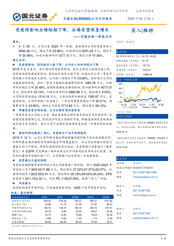 本报告分析了艾德生物2020年一季报业绩受疫情影响下降的情况,但强调了肿瘤伴随诊断市场的刚性需求和公司与阿斯利康合作带来的增长潜力。报告预测公司未来三年营收和净利润将保持快速增长,维持“买入”评级,但也提示了海外市场开拓、产品降价和市场竞争等风险。