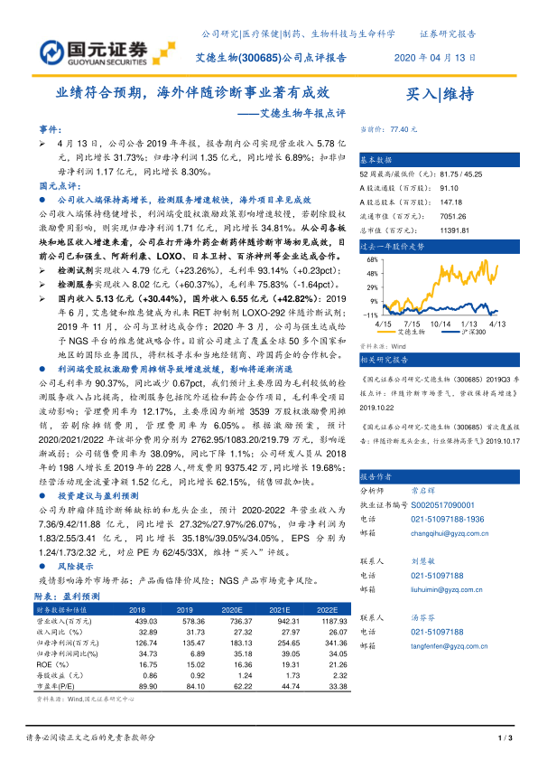 本报告分析了艾德生物2019年年报,公司业绩符合预期,海外伴随诊断业务取得显著成效。虽然利润端受到股权激励费用摊销的影响,但预计未来影响将逐渐减弱。公司作为肿瘤伴随诊断领域的龙头企业,未来发展前景广阔,维持“买入”评级。同时,报告也提示了疫情、产品降价和市场竞争等风险。