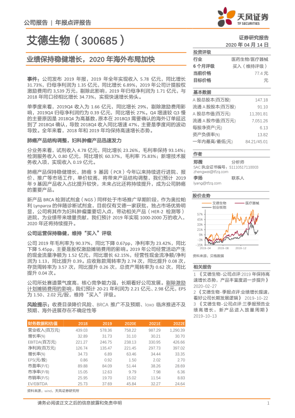 剔除股权激励计划摊销费用的影响,天风证券预计艾德生物2020年和2021年的净利润将分别达到2.21亿元和2.98亿元,对应的每股收益(EPS)分别为1.50元/股和2.02元/股。基于此,报告维持对艾德生物的“买入”评级。