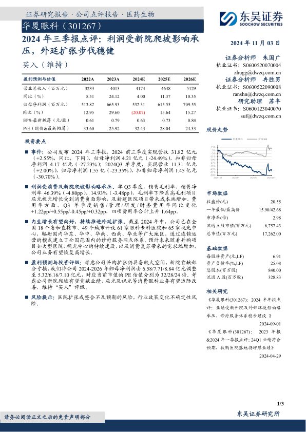 华厦眼科2024年前三季度业绩显示,公司营收增速放缓,利润因新院爬坡成本和消费需求疲软而承压。尽管短期内面临挑战,公司通过稳健的外延扩张策略,已建立起广泛的全国性诊疗服务网络。分析师下调了未来三年的盈利预测,但基于新院业绩贡献潜力及消费眼科业务的改善预期,维持了“买入”评级。公司未来增长的关键在于新并购项目的顺利整合与运营,以及宏观消费环境的复苏。投资者需关注医院扩张整合及行业政策变化的潜在风险。