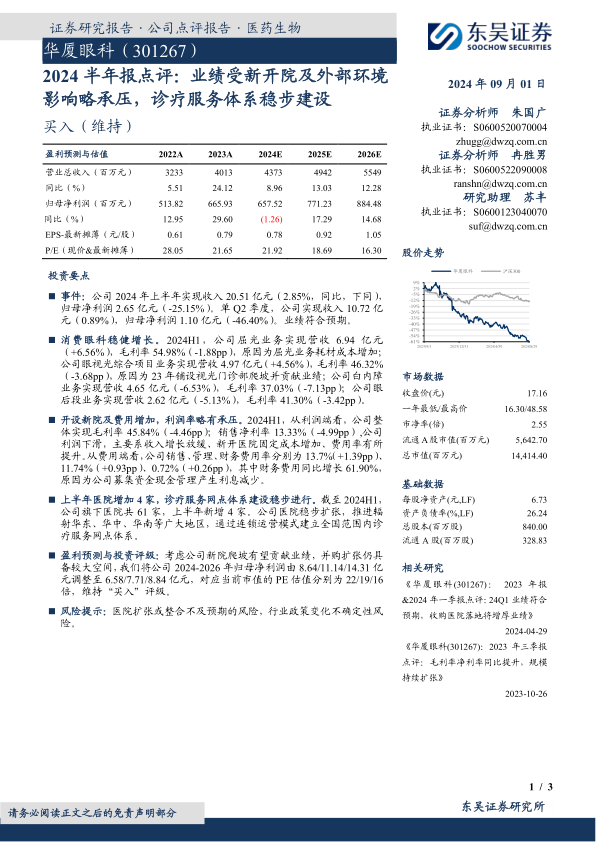 华厦眼科2024年上半年业绩受到新开医院和外部环境影响略有承压,但消费眼科业务保持稳健增长,公司持续推进诊疗服务体系建设。报告下调了公司盈利预测,但考虑到公司未来发展潜力,维持“买入”评级,并提示了医院扩张和行业政策变化的风险。