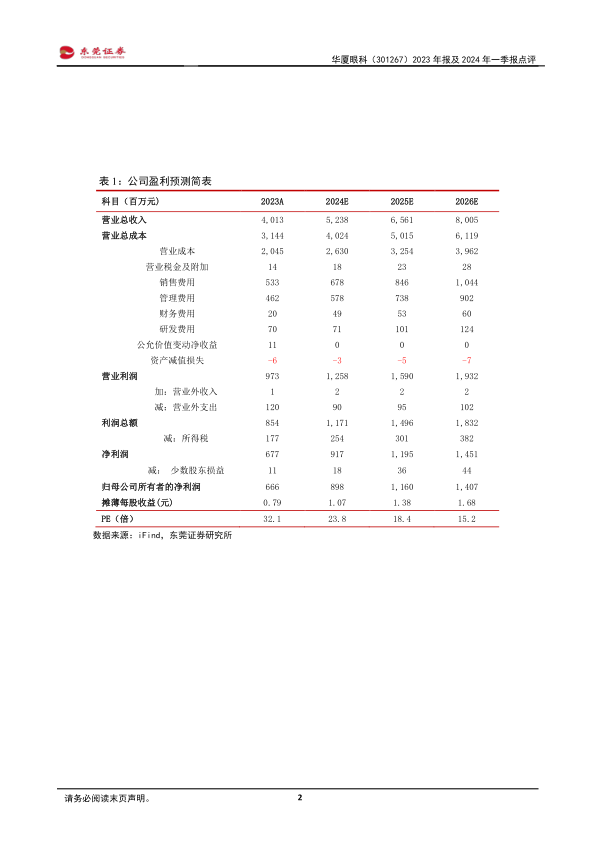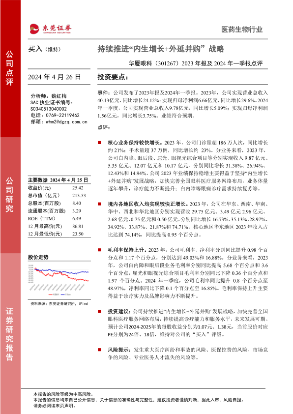 投资建议:公司持续推进“内生增长+外延并购”发展战略,加快完善全国眼科医疗服务网络布局,持续提高诊疗能力和服务水平,未来发展可期预计公司2024-2025年的每股收益分别为1.07元、1.38元,当前股价对应PE分别为24倍、18倍,维持对公司的“买入”评级。
