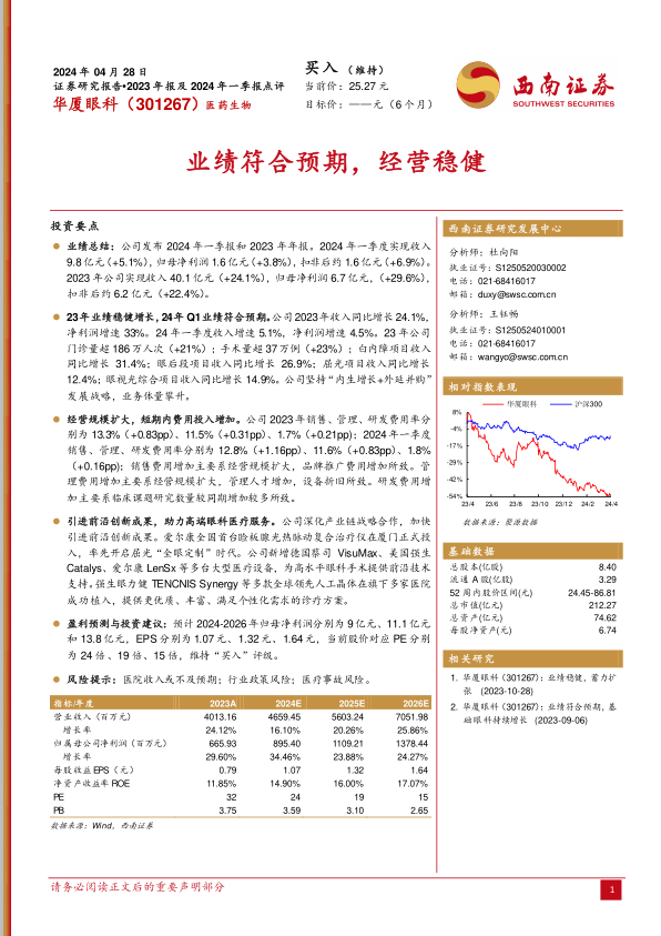 华厦眼科在2023年及2024年一季度均实现了稳健的业绩增长,通过“内生增长+外延并购”战略持续扩大市场份额,并积极引进前沿技术和高端设备,提升了其在眼科医疗服务领域的竞争力。尽管短期内因经营扩张导致费用投入有所增加,但公司盈利能力预计将持续提升。基于对各项业务的审慎预测,分析师维持“买入”评级,并提示投资者关注医院收入、行业政策及医疗事故等潜在风险。