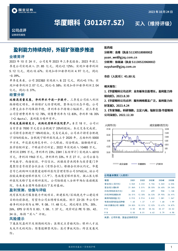 本报告分析了公司2023年三季度业绩,指出公司在收入利润方面维持稳定增长,盈利能力持续提升。通过收购合肥视宁和投资厦门华厦眼科,公司在外延发展方面持续发力,加速全国市场布局。报告维持对公司“买入”评级,并提示了相关风险。总体而言,公司经营稳健,未来发展前景可期。